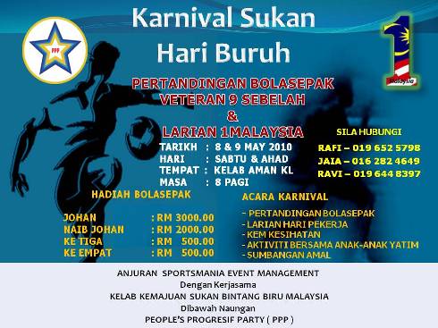 SATU LARIAN HARI PEKERJA AKAN DIADAKAN PADA 9 hb. MAY 2010, BERMULA DARI BANGUNAN PEKESO JALAN AMPANG DAN BERAKHIR DI PADANG KELAB AMAN KUALA LUMPUR. TIADA HADIAH ATAU WANG KEMENANGAN DISEDIAKAN. LARIAN INI MERUPAKAN SATU LARIAN AMAL BAGI MENGUTIP DERMA UNTUK RUMAH-RUMAH ANAK YATIM DI SEKITAR LEMBAH KLANG.